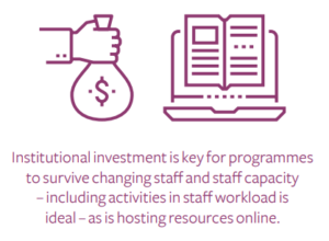 The work of the internship students and the Senior Research Assistant show how valuable it is to have engagement work included in workload. If an individual leaves their position then their replacements will have a clear framework to continue this work and an incentive to do so. With the exception of LifeLab, and the coordination of Dragonfly Day which is managed by the university WP team, Discover Oceanography was the only project working with Talk to US! with dedicated staff and independent funding streams. However, if the desired culture change is achieved then it is more likely that appointments of this nature will be made in other departments – and, perhaps, eventually, in schools and colleges as well as universities.